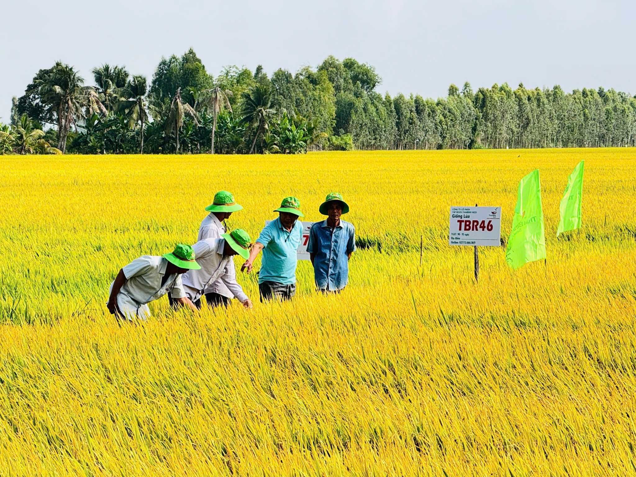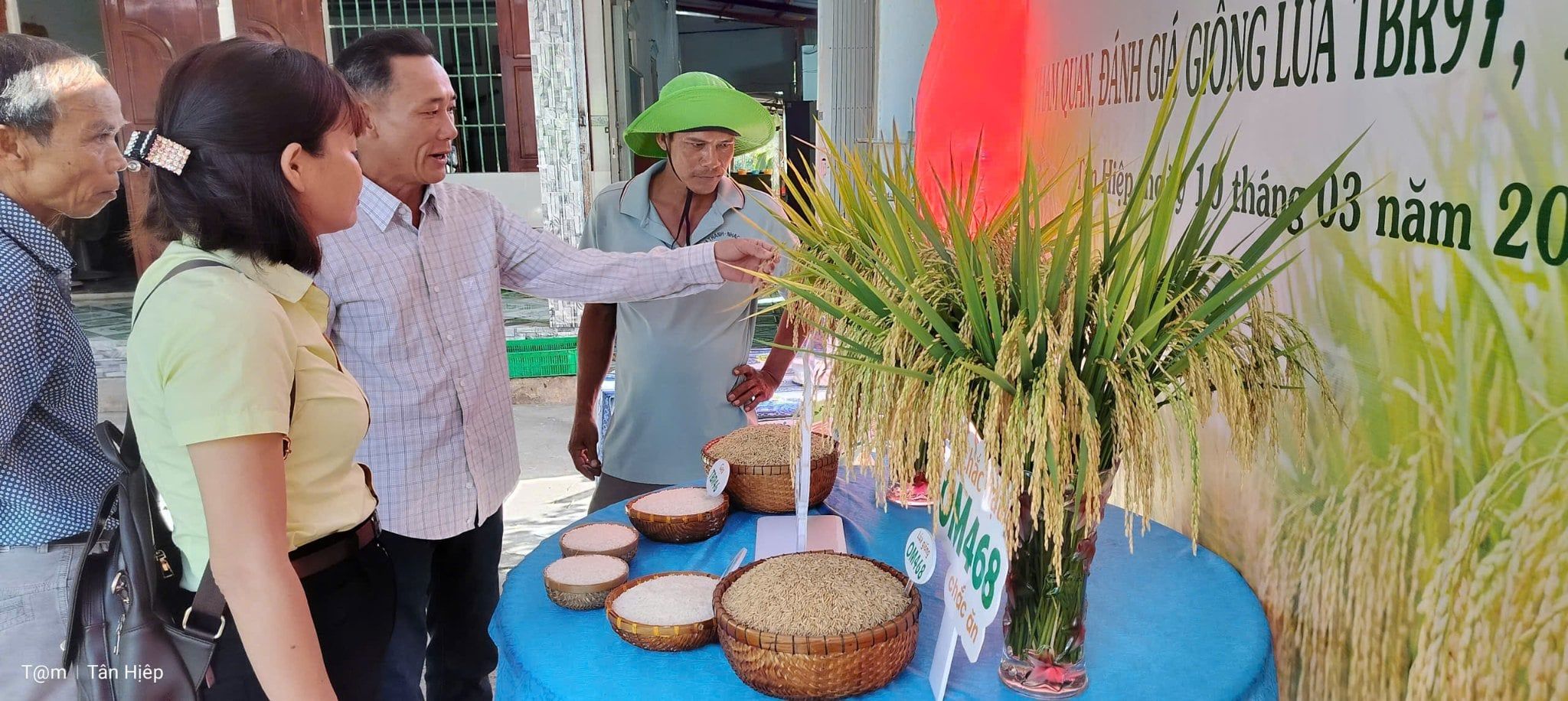 Ngay tại ruộng trình diễn, bà con nông dân được trực tiếp quan sát sinh trưởng và đánh giá thực tế các giống lúa TBR97, OM468 và TBR46. Đây là những giống lúa đang được kỳ vọng phù hợp với điều kiện canh tác của vùng Đồng bằng sông Cửu Long nhờ khả năng sinh trưởng khỏe, chống chịu sâu bệnh khá, thích nghi tốt với điều kiện đất đai và thời tiết tại địa phương.