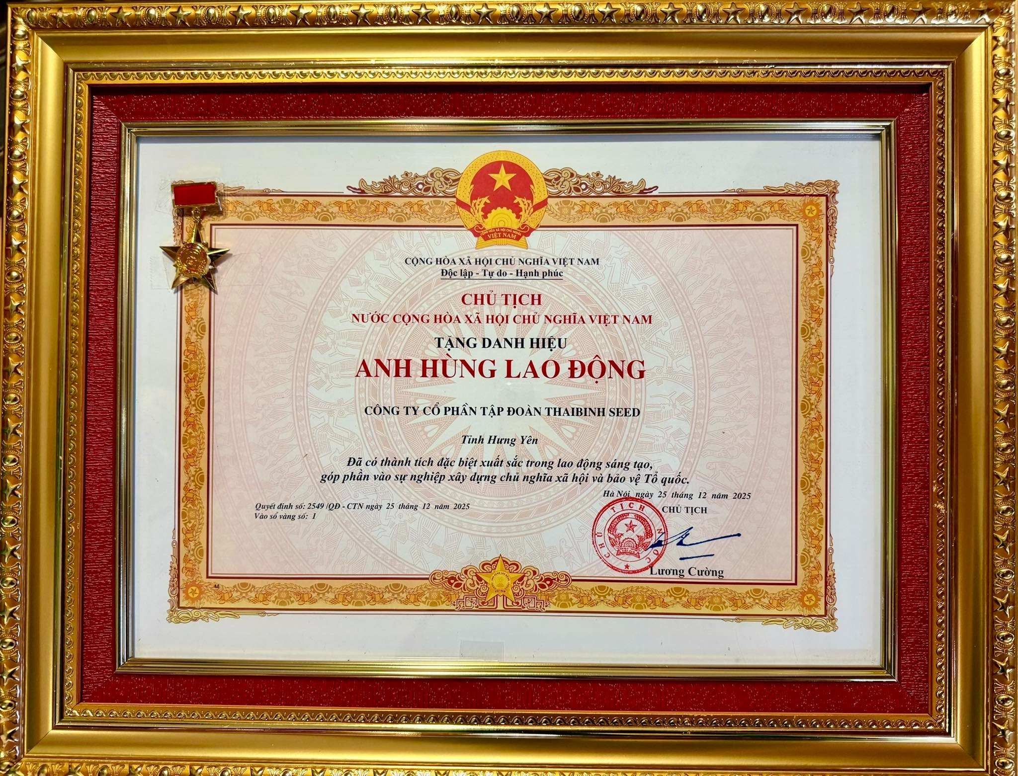 Theo Quyết định số 2549/QĐ-CTN ký ngày 25/12/2025 của Chủ tịch nước Cộng hòa xã hội chủ nghĩa Việt Nam, danh hiệu Anh hùng Lao động được phong tặng cho Tập đoàn ThaiBinh Seed là sự ghi nhận xứng đáng đối với chặng đường hơn nửa thế kỷ bền bỉ đổi mới, sáng tạo, không ngừng nghiên cứu, chọn tạo và sản xuất giống cây trồng chất lượng cao, đồng hành cùng nền nông nghiệp Việt Nam trong tiến trình hiện đại hóa và hội nhập quốc tế.